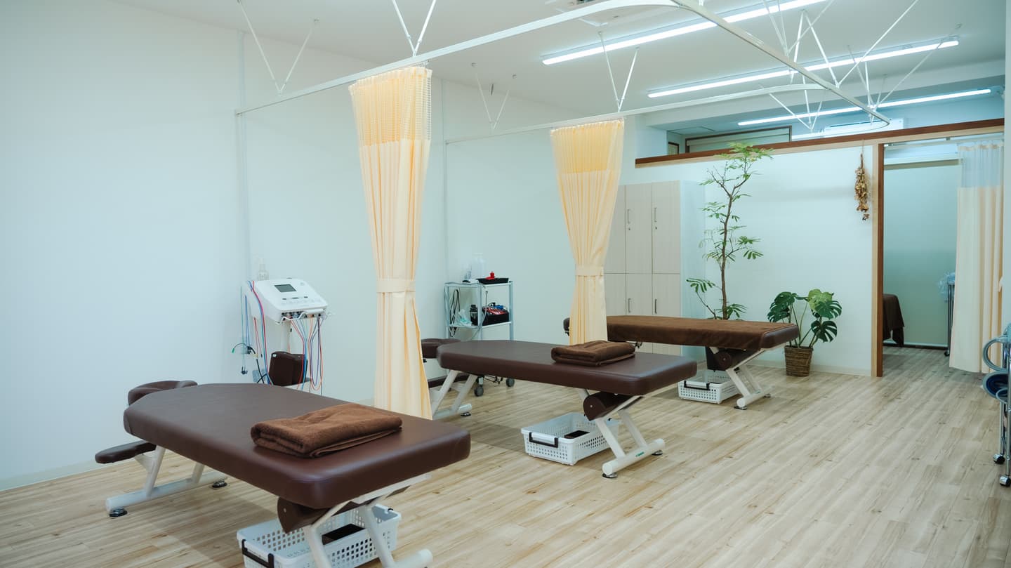 院内紹介院内の様子です。ベッドは3台。患者さんがリラックスできるよう、施術ブースにゆとりを持たせています。奥は鍼灸ルームになっていてベッドが1台あります。 |